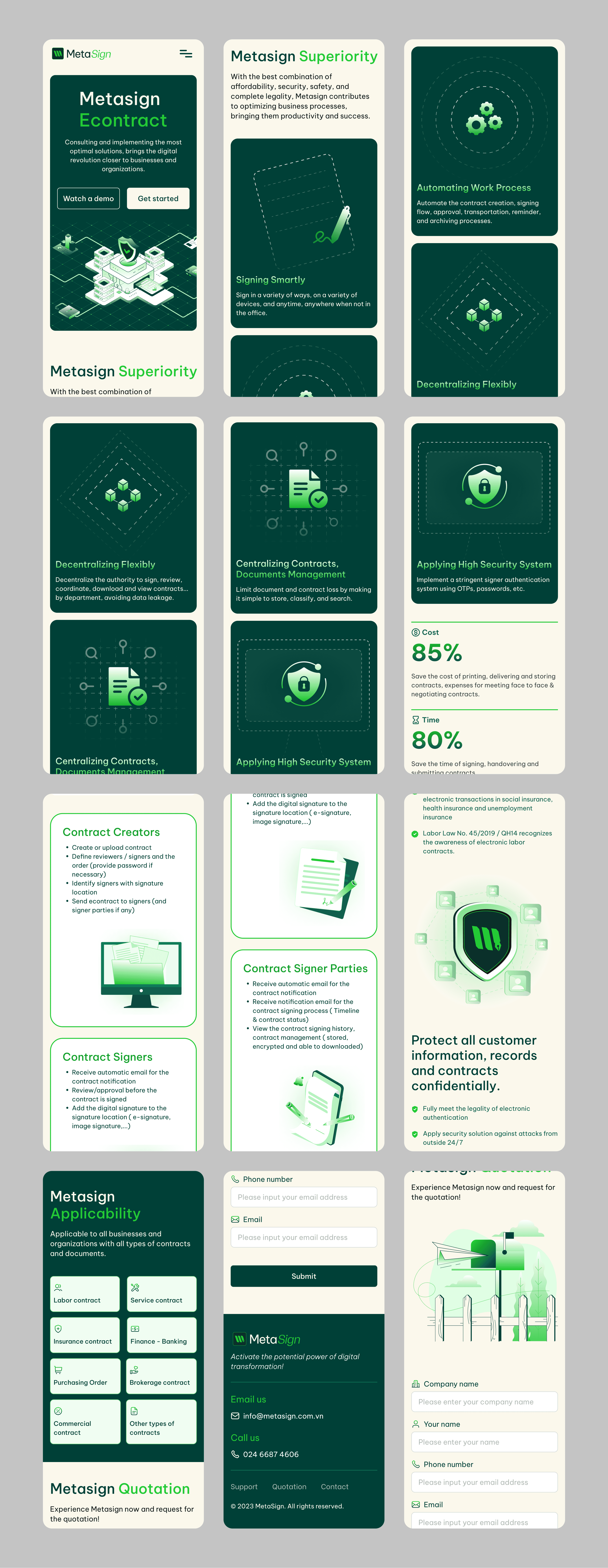 MetaSign is a new e-contract platform; it needs a brand new visual identity to effectively communicate its features and user benefits. This site will emphasize MetaSign's features, demonstrate its value proposition, and particularly highlight how it simplifies and secures the contract signing process for various business fields